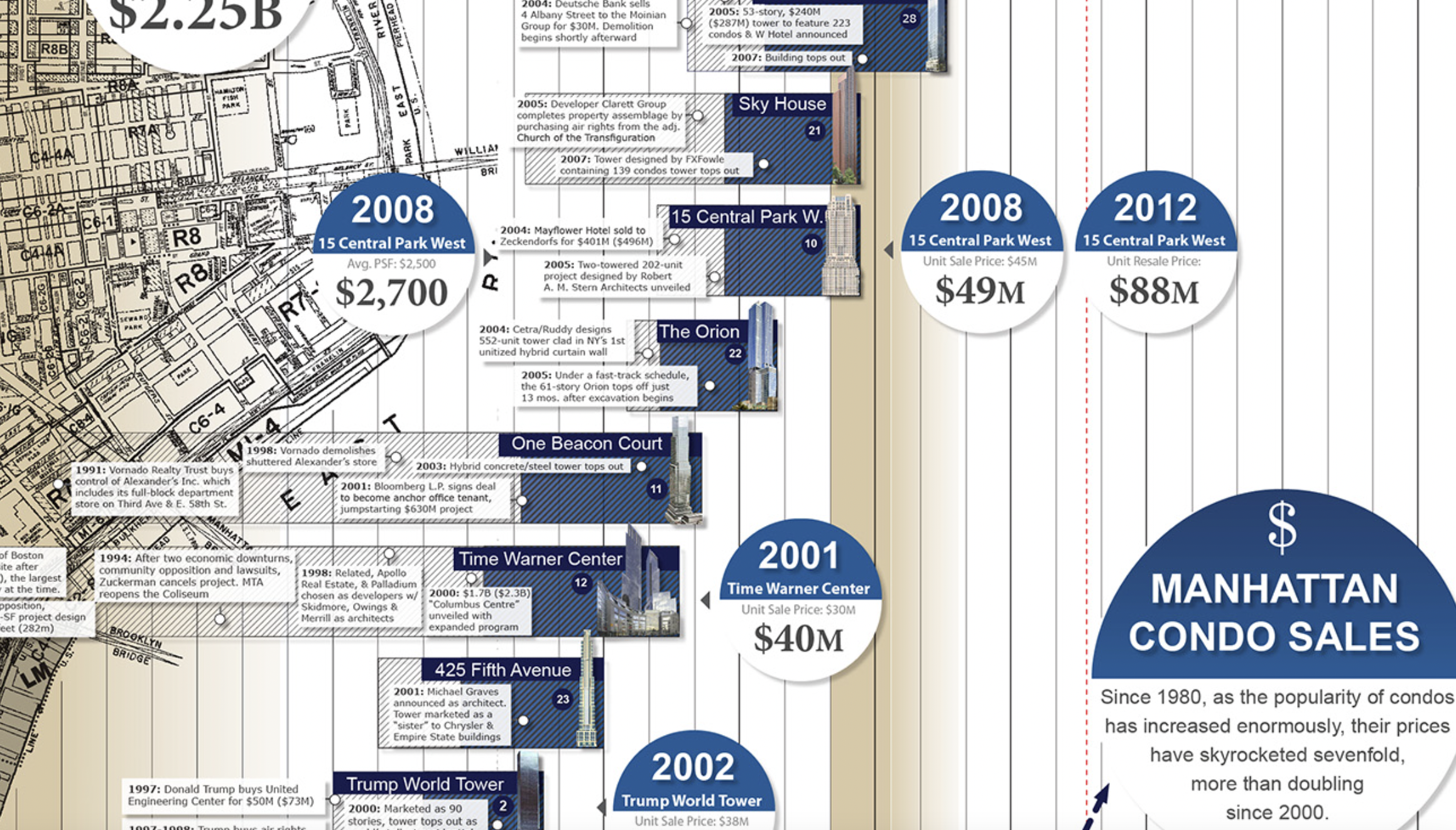 Each of the buildings has its own timeline, separated into two or more sections indicating the land and air acquisition (in white hatching), design, and construction phases. In the balloon circles, the top date refers the year the building was completed; the only exceptions are yellow circles, meaning "under construction." The bottom of the circle shows the price of the highest-priced unit in 2013 currency. Click on the timeline to enlarge it. A detail of the timeline is below.