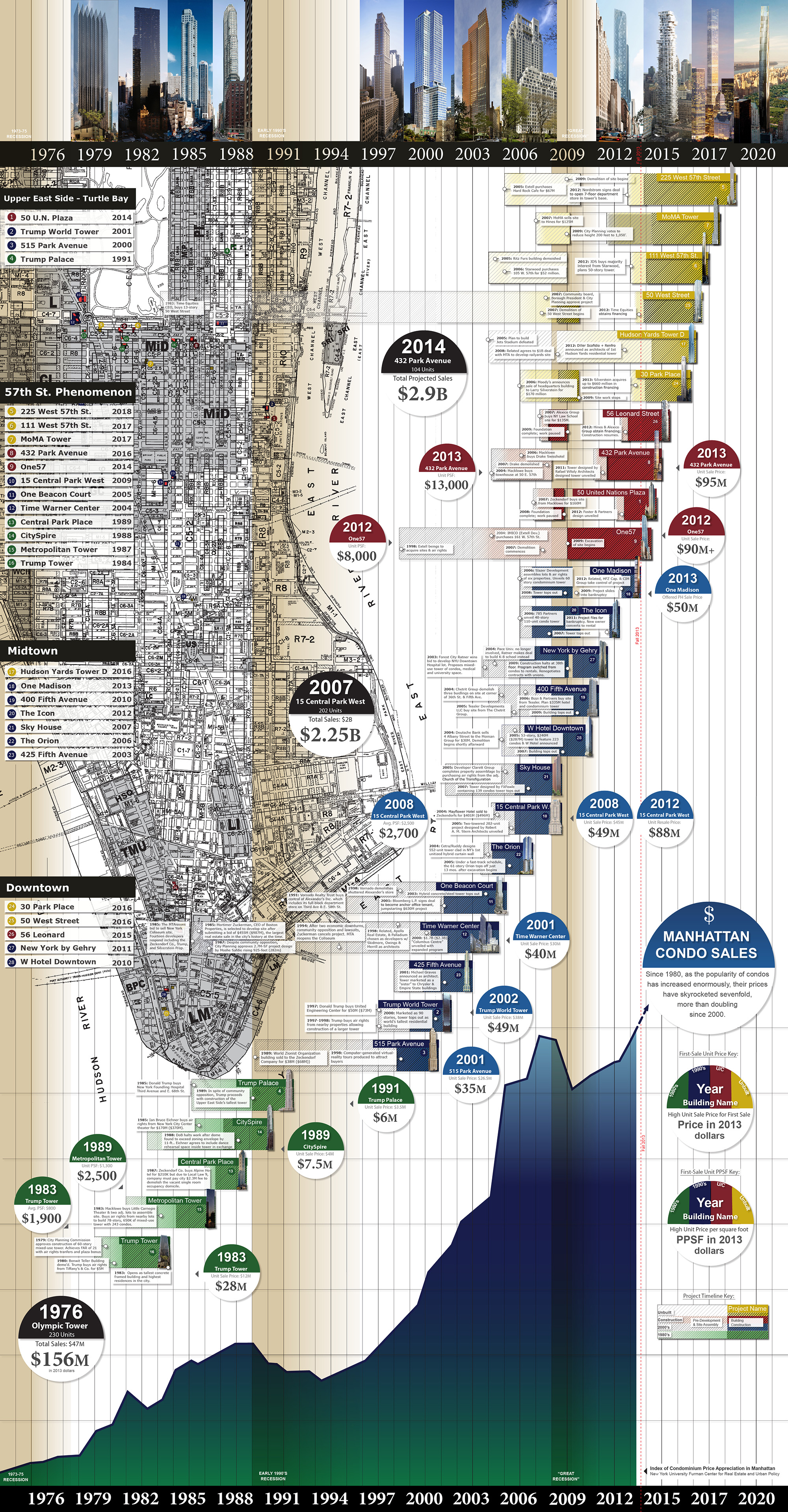 The base map locates all the projects, which are color-coded by construction era and organized by districts. The obvious concentration of recent projects on the 57th St. corridor is thus shown in the context of precedents of the 1980s and 1990s. Each project has an individual timeline that spans phases from site assembly to completion and, where available, a balloon that gives the reported first sale of the highest-priced condo unit. Prices are adjusted to 2013 dollars.
