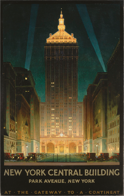 Completed in 1929 – sixteen years after the opening of Grand Central Terminal, and designed by the same architects, Warren & Wetmore – the New York Central Building was erected by the railroad for their new administrative offices, and as another revenue-producing property. The 35-story tower rose astride Park Avenue, establishing a skyscraper counterpart to the monumental, low-rise station and placing an emphatic exclamation point to the vista of the boulevard from the north.