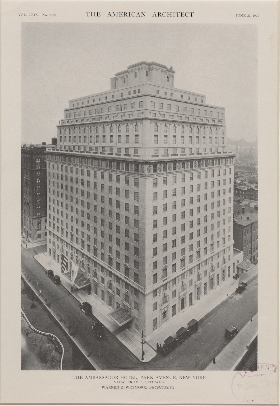 3: Ambassador Hotel, Park Avenue, View from Southwest, Warren & Wetmore, Architects, The American Architect, [Vol. CXIX, No. 2370] June 22, 1921. Collection of The Skyscraper Museum
