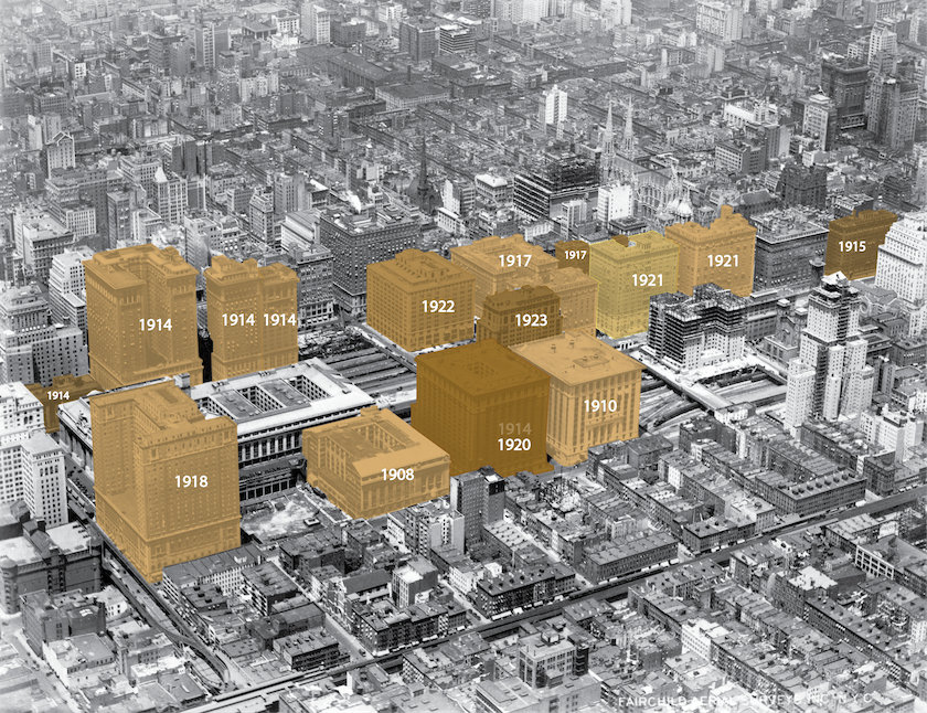 1: Chronology of Terminal City Buildings, The Skyscraper Museum, overlaid on a Fairchild Aerial Survey, 1923. Photograph by Sherman Fairchild, New York State Archives.