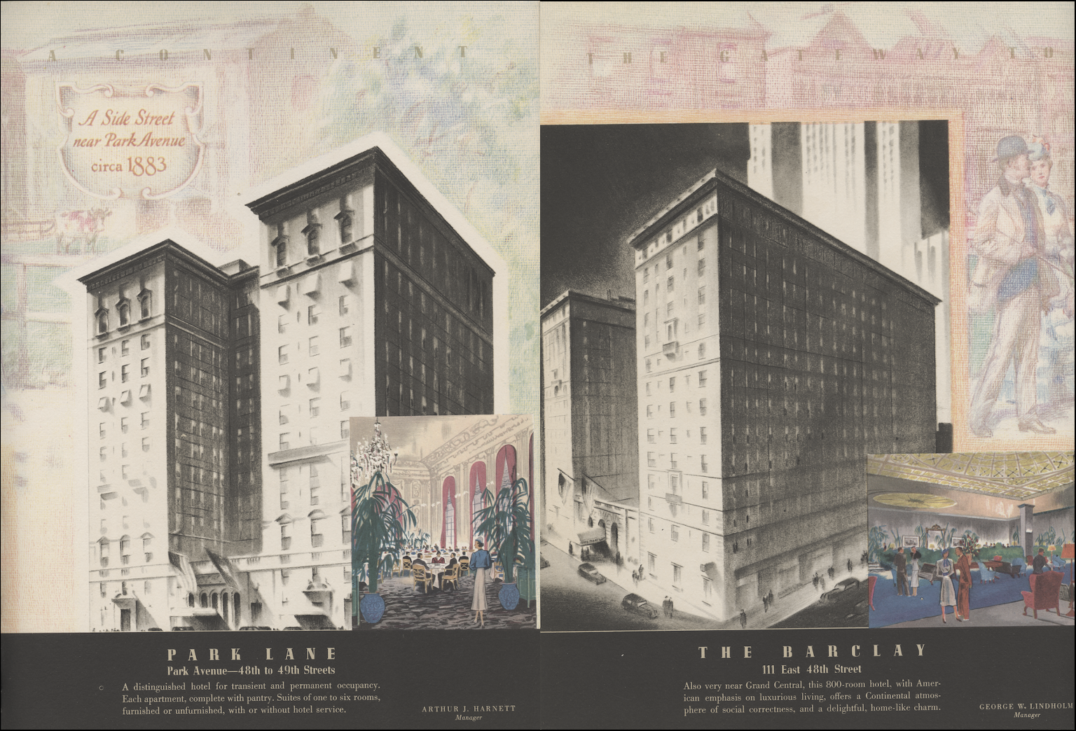 The Central also leased the air rights above the empty blocks on Park Avenue north of 46th Street to developers who designed their own projects. The majority of the new buildings erected from 1917 to 1924 were hotels or apartment hotels. While many of these buildings had luxurious apartments of ten or more rooms, they were classified by the City as hotels because they had no private kitchens. Examples pictured here include the Marguery and Chatham (photo at back) and the Barclay and Park Lane (book).