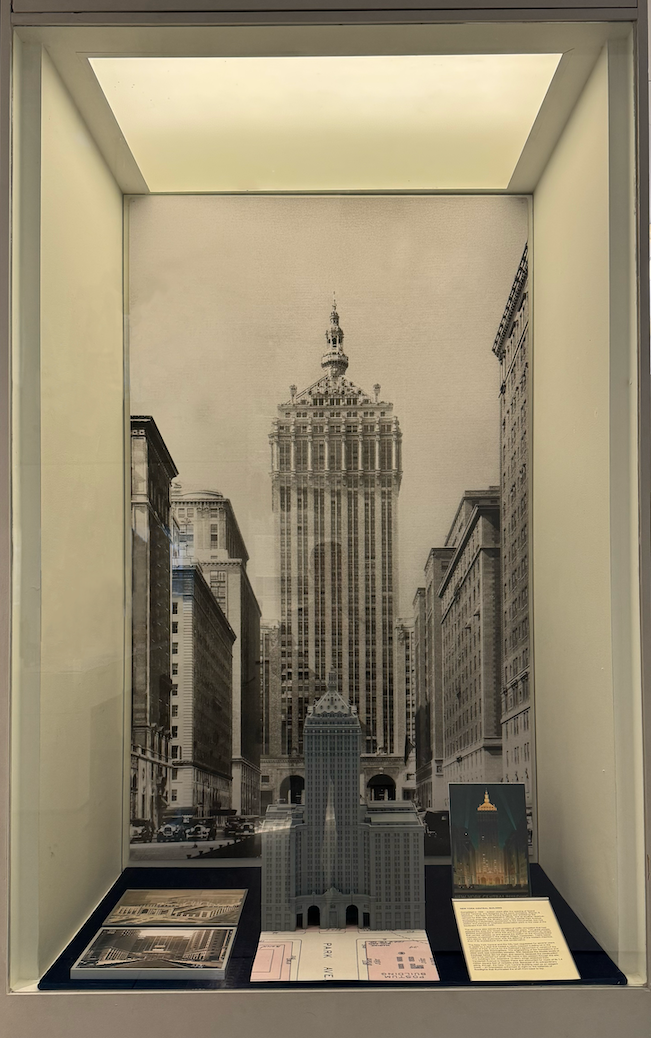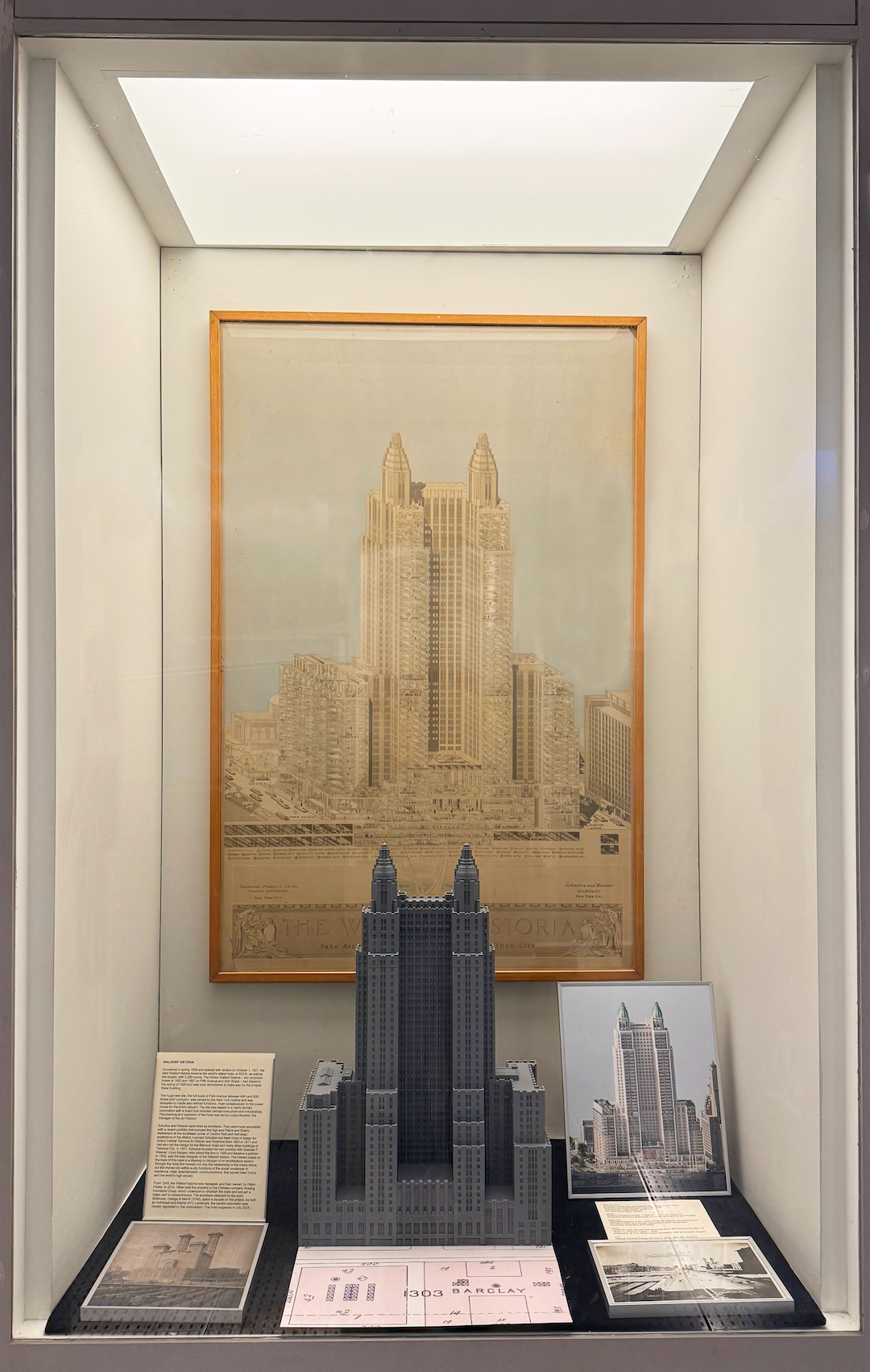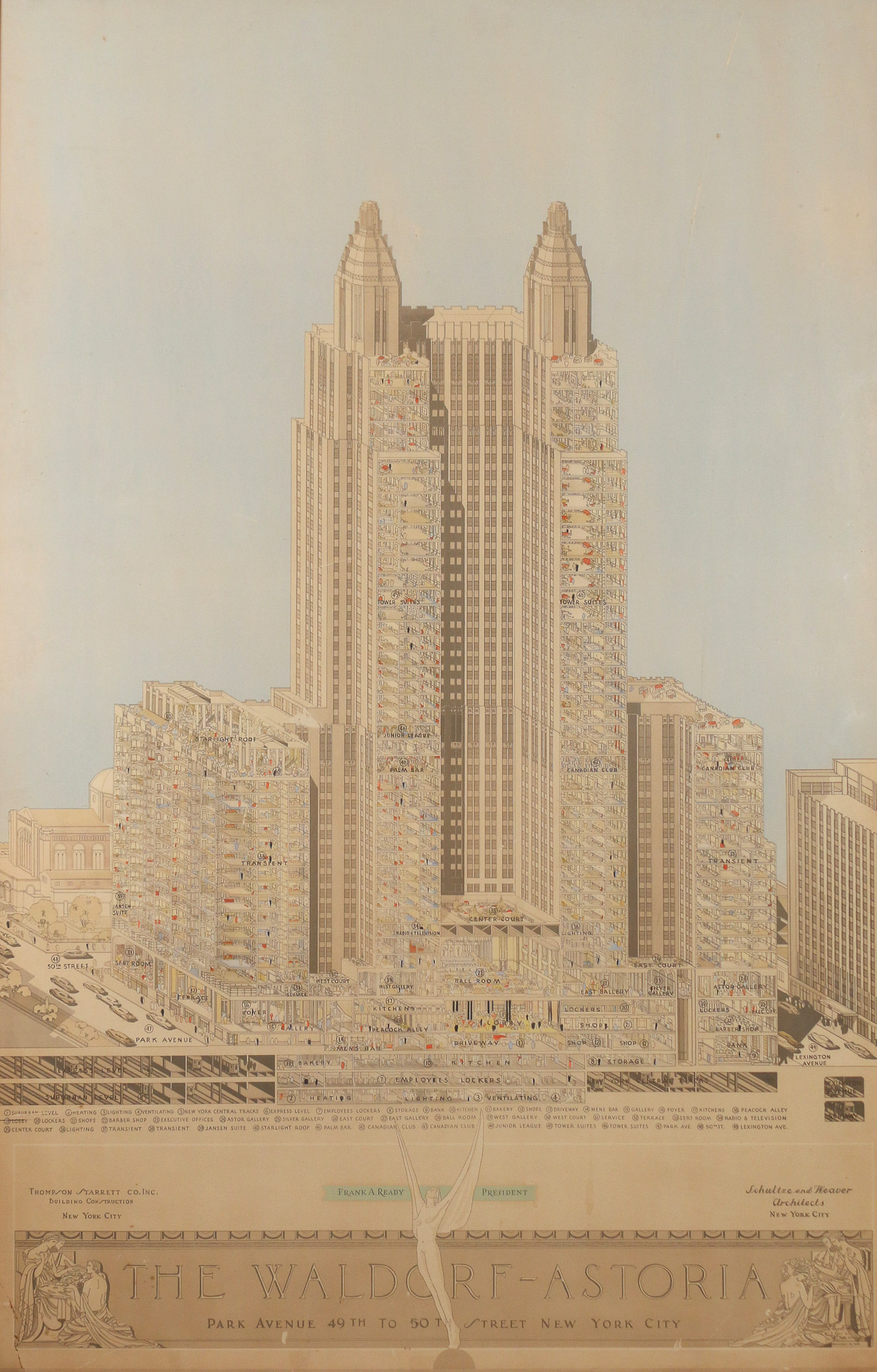 Schultze and Weaver were hired as architects. They were hotel specialists, with a recent portfolio that included the high-end Pierre and Sherry-Netherland at the southeast corner of Central Park and had deep experience in the district. Leonard Schultze had been chief of design for Grand Central Terminal for Warren and Wetmore from 1903 to 1911 and had also led the design for the Biltmore Hotel and many other buildings of Terminal City. In 1921, Schultze founded his own practice with Spencer F. Weaver. Lloyd Morgan, who joined the firm in 1926 and became a partner in 1929, was the lead designer of the Waldorf Astoria. The framed poster on the back of this case is a drawing by Morgan of an architectural section through the hotel that reveals not only the relationship to the tracks below, but the myriad city-within-a-city functions of the social condenser of residence, retail, entertainment, communications, that served New York’s and the world’s high society.
