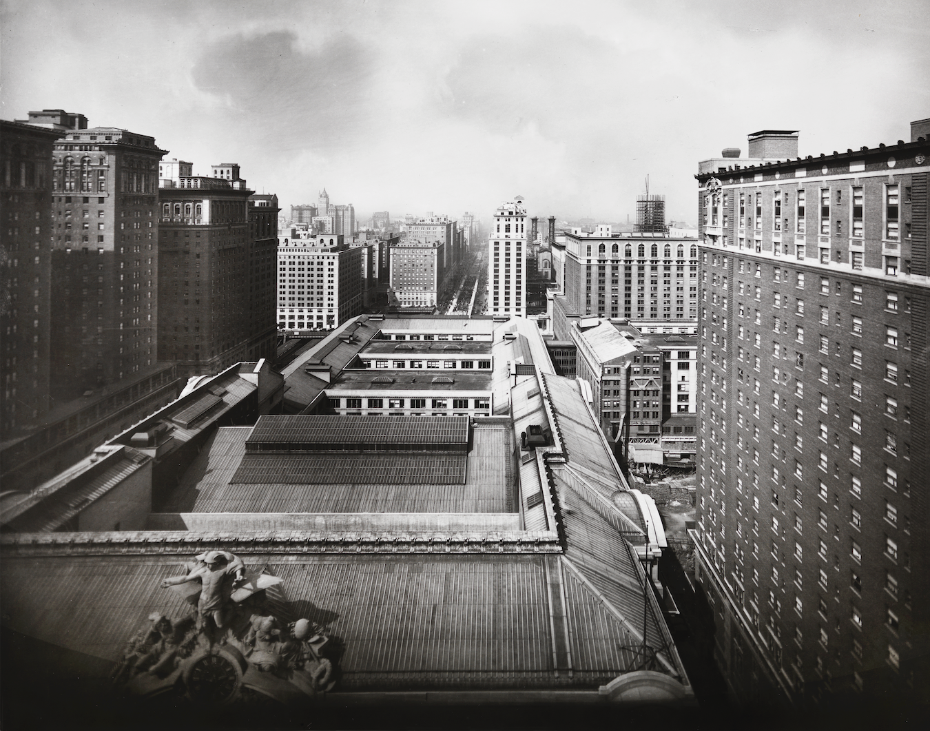 This spectacular, romantic, aerial photograph of 1932 by the Wurts Brothers captures the Park Avenue skyline at the culmination of the late-Twenties boom in development that brought a new scale of design and construction to Midtown: skyscrapers. Park Avenue cuts diagonally from the lower center to the upper right, where the tower of the New York Central (now Helmsley) Building formalizes the terminal’s connection to the new district of Park Avenue it created to its north. As both New York and America slid further into the Great Depression, 1932 also marked the end of the ebullient era of speculative construction, as well as the spending sprees that supported the high-society lifestyles of residential Park Avenue.
