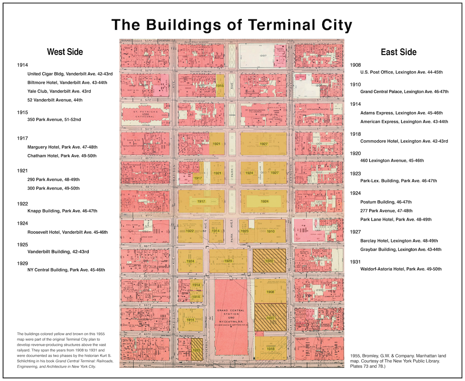 The map, aerial photograph, and slide shows chronicle the year-by-year additions to the Terminal City district. The buildings colored yellow and brown on the 1955 map were part of the original Terminal City plan to develop revenue-producing structures above the vast railyard. They span the years from 1908 to 1931 and were documented as two phases by the historian Kurt S. Schlichting in his book Grand Central Terminal: Railroads, Engineering, and Architecture in New York City. The Museum also denotes the building in yellow and brown on an aerial photograph by Sherman Fairchild, which illustrated in 3D how Park Avenue was built up through 1923.