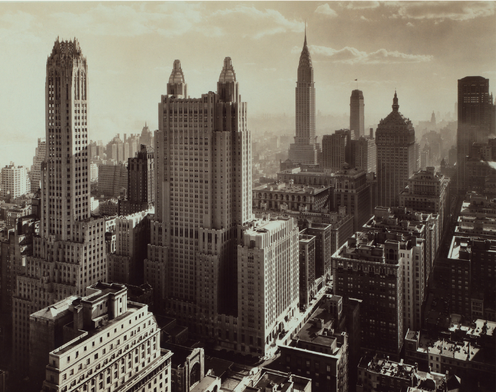 The new style of setback skyscrapers of the late 1920s boom expressed the late Twenties’ exuberant real estate speculation. The shapes of the towers followed the new rules of the 1916 zoning law that required regular setbacks in the building’s massing, but permitted a tower to rise to unlimited height over a quarter of the area of the site. The RKO/ General Electric Building in the left foreground and the distinctive profile of the Chrysler Building in the center background are examples of the characteristic formula.